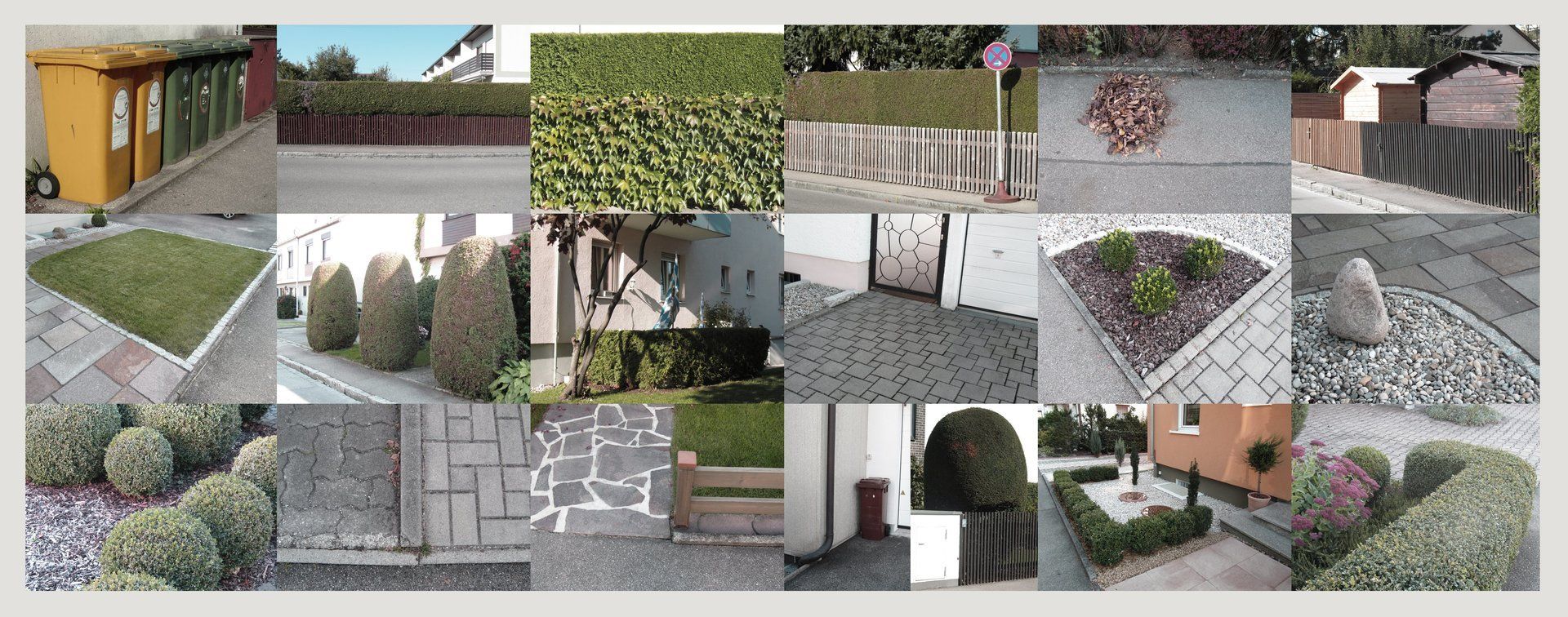 Vorstadtidylle versus Unordnung und Rückkehr der Natur. Serienbilder mit Aufnahmen von deutschen Vorstädten und Vorgärten. Genormte Formen und Pflegeleichtigkeit versus Wildwuchs und Renaturierung.